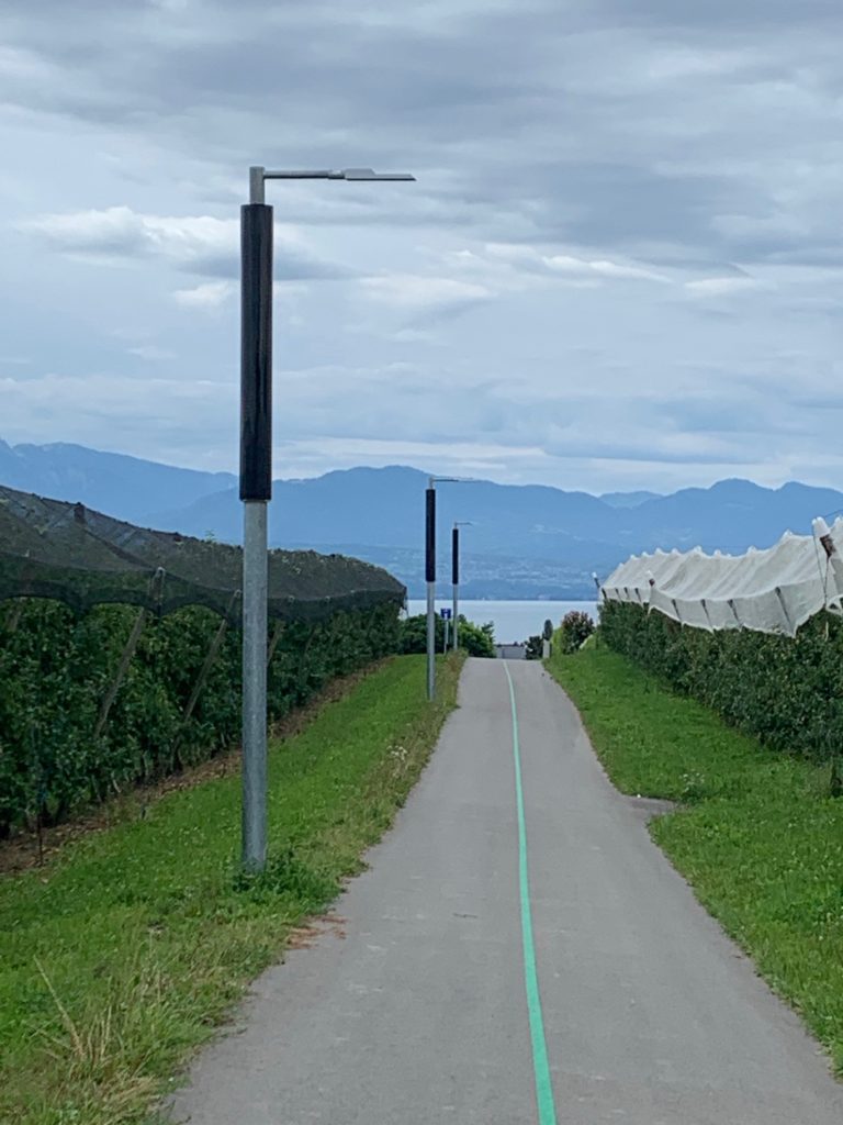 Le chemin du Monteiron fait partie des itinéraires concernés. Ce dernier est régulièrement emprunté, à pied ou à vélo, par les habitants de Denges pour accéder aux transports publics, notamment les actifs et les écoliers. Les déplacements ayant souvent lieu en début de matinée ou en soirée, plusieurs demandes ont été adressées à la Municipalité pour améliorer le sentiment de sécurité sur cet itinéraire. Ainsi, il a été décidé d’installer un éclairage public solaire sur l’itinéraire reliant le centre du village et l’arrêt de bus Pierraz-Mur.