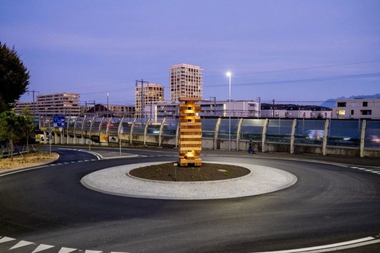L’ancien carrefour a été transformé en un giratoire de 28 mètres de diamètre situé en partie hors de la chaussée actuelle et sera constitué d’un anneau de circulation de 6.50 mètres de large, d’un anneau semi-franchissable d’une largeur de 3 mètres et d’un îlot central infranchissable présentant un diamètre extérieur de 9 mètres. Une œuvre de l’artiste morgienne Marielle Blanc « La Tour en Équilibre » a été choisie pour orner le nouveau giratoire.