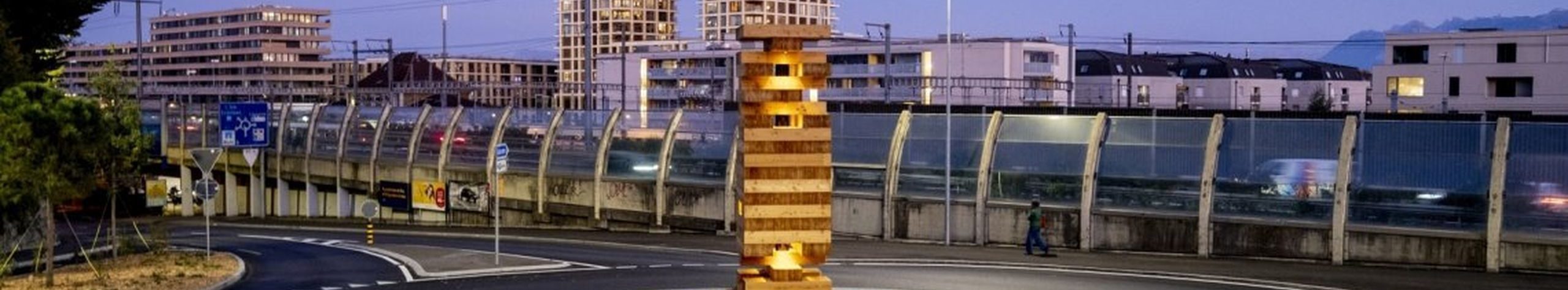 L’ancien carrefour a été transformé en un giratoire de 28 mètres de diamètre situé en partie hors de la chaussée actuelle et sera constitué d’un anneau de circulation de 6.50 mètres de large, d’un anneau semi-franchissable d’une largeur de 3 mètres et d’un îlot central infranchissable présentant un diamètre extérieur de 9 mètres. Une œuvre de l’artiste morgienne Marielle Blanc « La Tour en Équilibre » a été choisie pour orner le nouveau giratoire.
